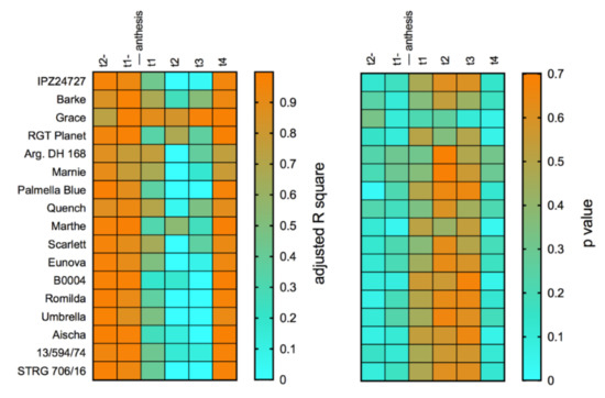 Adjusted R2 and respective p values of genotype-wise multiple linear regression models for the two weeks before and four weeks after anthesis relative to flowering date in the seasons 2016 to 2020. The model Equation (1) was used to calculate multiple linear regressions to determine effects of weather conditions before and after anthesis on content of F. culmorum DNA in mature barley heads.