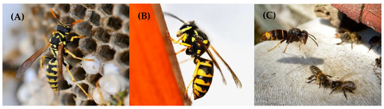 (A): Polistes gallicus in its nest. (B): Vespula germanica sipping nectar. (C): Vespa Velutina hunting bees in a hive.