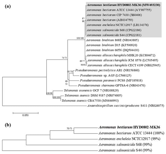 Phylogenetic position of HYD0802-MK36 that was newly isolated from the field throughout this study was determined based on partial sequences (1533 bp) of 16S ribosomal RNA (rRNA) (Figure 1). As a result, HYD0802-MK36 was grouped together with species of genus Aeromonas; A. bestiarum KTCC13444 (AY987755), A. bestiarum CIP7430 (X60406), A. bestiarum (AB034759), A. encheleia NCTC12917 (LR134376), and A. salmonicida S68 (CP022186), A. salmonicida S44 (CP022181) (Figure 1a). To identify this bacterial strain, additional phylogenetic analysis was carried out using the three Aeromonas species which showed ≥99% similarity (16S rRNA gene sequences) with HYD0802-MK36. Compared to other species, A. bestiarum was the phylogenetically closest species with HYD0802-MK36, and thus we identified HYD0802-MK36 as A. bestiarum (Figure 1b).