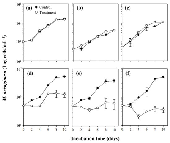 The bacterial inoculum density [19,20,21] and physiological status (=growth phase) of host algae [4,22] are recognized as key factors, determining level of algicidal activity of bacteria. In our results, levels of algicidal activities of both bacterial strains against M. aeruginosa gradually elevated according to increase in inoculated density of each bacterial species (Figure 2). In addition, the two bacteria showed higher algicidal activity against lower cell densities (104, 105 cells mL−1) of M. aeruginosa than 106 cells mL−1 of M. aeruginosa. Based on Mange et al. [20], algicidal bacteria are capable of more easily lysing host algal cells at the lag and exponential phases, compared to the stationary phase, due to the relatively weak cell wall, a result of active cell division. This might lead to reduction in level of algicidal activity of bacteria against the highest cell density (106 cells mL−1) of M. aeruginosa, corresponding to the stationary phase.