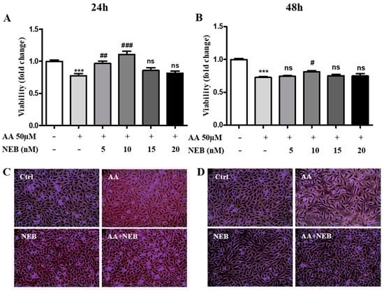 Effect of NEB on AA endothelial cells toxicity (EAhy926). Viability was determined using the resazurin test on cells cultured for 24 h (A) or 48 h (B) under standard culture conditions or in the presence of 50 µM AA and different concentrations of NEB (5, 10, 15 and 20 nM). Representative images of EAhy926 cells’ morphology under standard culture conditions or in the presence of 50 µM AA and/or 10 nM NEB for 24 h (C) or 48 h (D) (200× magnification). Values are mean ± SEM showing the fold changes in viability relative to untreated cells. Each assay was completed at least three times, with six biological replicates each. Statistical analysis was performed by one-way ANOVA followed by Bonferroni’s multiple comparison test. ns, not significant; *** p < 0.001 vs. controls; # p < 0.05, ## p < 0.01 and ### p < 0.001 vs. AA.