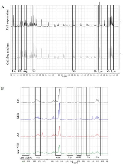 1H-NMR spectra (600 MHz) of cell supernatant (black) and cell free medium (grey) (A). 1H-NMR spectra (600 MHz) of intracellular extract from control group (black), 10 nM NEB group (blue), 50 µM AA group (red) and AA + NEB group (green) (B). Arg: arginine; Asp: aspartate; Glc: glucose; Gln: glutamine; Glu: glutamate; GPC: glycerophosphocholine; GSH: glutathione; Ile: isoleucine; Lac: lactate; Leu: leucine; UDP-GlcNAC: UDP-N-acetylglucosamine; Val: valine.