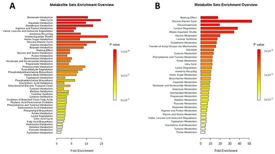 Graphic synopsis of metabolite set enrichment analysis (MSEA) of endothelial cellular extract (A) and extracellular supernatant (B). Results are expressed in a horizontal bar graph showing the most significant metabolite sets identified during analysis. Bars’ colors are based on p values (lower p values correspond to darker red), while bars’ lengths are based on the fold enrichment.