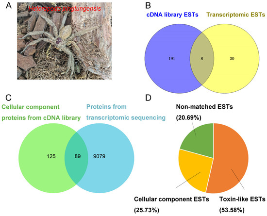 H. pingtungensis venom gland ESTs annotations and distributions. (A) The spider H. pingtungensis. (B) Toxin-like ESTs derived from cDNA library and/or transcriptome sequencing. (C) Overlap of cellular component proteins identified in the cDNA library group with those proteins derived from transcriptome sequencing. (D) The relative proportion of each transcript category of H. pingtungensis venom gland ESTs.