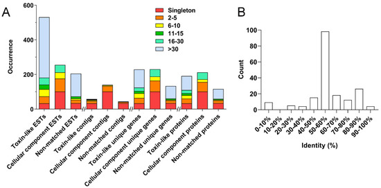 (A) EST, contig, unique gene, and protein distributions of toxin-like, cellular component, and non-matched ESTs among different cluster groups. (B) Toxins from H. pingtungensis were blasted against the toxins sequence library from H. venatoria, and the number of toxins showing different levels of homology (0–100% identity, in 10% increment) was counted, showing the toxin precursors from these two close spider species are basically different.