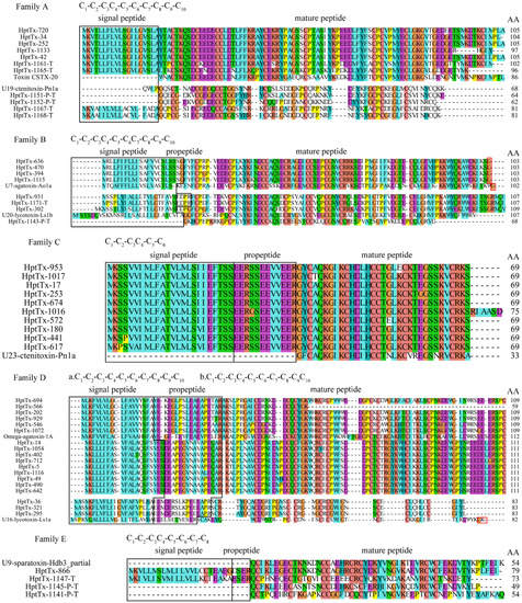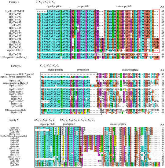 We named the toxin-like peptide from H. pingtungensis as HptTx-n, in which ‘Hpt’, ‘Tx’, and ‘n’ represents H. pingtungensis, toxin, and the clone number, respectively. In some cases, the capital letter ‘P’ or ‘T’ is added to the end of the toxin name to indicate that toxin is a partial sequence (HptTx-n-P) or derived from transcriptomic data (HptTx-n-T), respectively. BLAST analysis revealed that 176 out of 190 toxin precursors are likely of full-length with the complete signal peptide and mature peptide, for which the signal peptide was predicted using signalP5.0 (https://services.healthtech.dtu.dk/service.php?SignalP-5.0; accessed on 23 January 2022) [20], and the cut site between the propeptide and predicted mature peptide was determined by the Processing Quadruplet Motif (PQM) mode [21,22]. Sequences of all these novel toxins were deposited in the Genbank database (https://www.ncbi.nlm.nih.gov/genbank/; accessed on 24 January 2022) (Genbank accession numbers: OM362623—OM362812). As shown in Figure 3, these toxins were grouped into 13 families based on their sequence homology and cysteine frameworks.