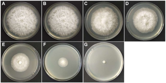 The effect of thymol on the growth of F. graminearum hyphae. (A) Control group; (B) 5 μg/mL thymol treatment group; (C) 10 μg/mL thymol treatment group; (D) 20 μg/mL thymol treatment group; (E) 40 μg/mL thymol treatment group; (F) 80 μg/mL thymol treatment group; (G) 160 μg/mL thymol treatment group.
