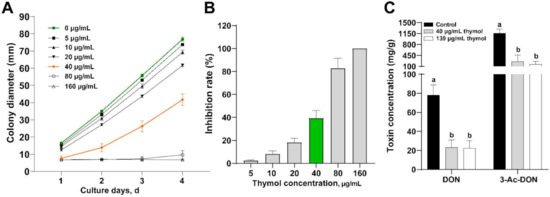 The data were shown as mean ± standard deviation, comparing colony diameter, inhibition rate, DON, and 3-Ac-DON concentration. The values were analyzed by a one-way analysis of variance (ANOVA), followed by Duncan’s multiple range test, and different letters indicated significant differences at p < 0.05, compared with different concentrations of thymol. All analyses were performed with the GraphPad Prism 8.0 software (GraphPad Software, Inc., San Diego, CA, USA).