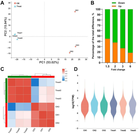 Analysis of the relationship between samples. (A) PCA analysis between samples; (B) Percentage of up-regulated/down-regulated unigenes identified by different multiples of difference; (C) Heat map of correlation analysis between samples; (D) Distribution of expression levels. CK is the control group, and Treat is the thymol treatment group.