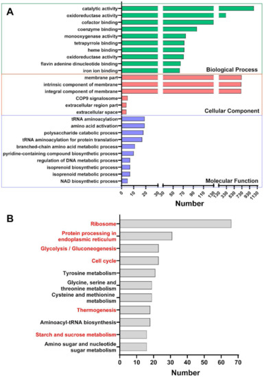First, we used a functional enrichment analysis to understand the differentially expressed unigenes’ functional pathways. The functional enrichment analysis of GO is shown in Figure 5A. The Top3 of BP were Catalytic activity, Oxidoreductase activity, and Cofactor binding. The Top3 of CC were Membrane part, Intrinsic component of membrane, and Integral component of membrane; the Top3 of MF were tRNA aminoacylation, Amino acid activation, and Polysaccharide catabolic process. The functional enrichment analysis of the Kyoto Encyclopedia of Genes and Genomes (KEGG) can be seen in Figure 5B. The Top3 of MF were Ribosome, Protein processing in endoplasmic reticulum, and Glycolysis/Gluconeogenesis.