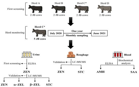 Zearalenone concentrations in the collected urine samples were measured by ELISA every two months, as described below, and urine samples were measured monthly when deemed necessary by the herd manager monitoring the condition of the roughage being fed or by contamination status of the roughage by fungi at the monthly sampling. During the follow-up period, daily feeding was performed while sharing the urinary ZEN concentration measurement results with the herd manager and the managing veterinarian. When a high urinary ZEN concentration was confirmed, the roughage lot fed at the time of sampling was changed, and the urinary ZEN concentration was measured again in the following month for follow-up purposes, concomitant with measurement of both ZEN and STC concentrations of roughage samples by LC-MS/MS as mentioned below. Concentrations of urinary ZEN, its metabolites, α-ZEL, β-ZEL, and STC of all collected urine samples during the follow-up period were measured by LC-MS/MS within one assay for reconfirmation of results by the ELISA assay and urinary STC measurement. A schematic representation of the experimental design is shown in Figure 2.