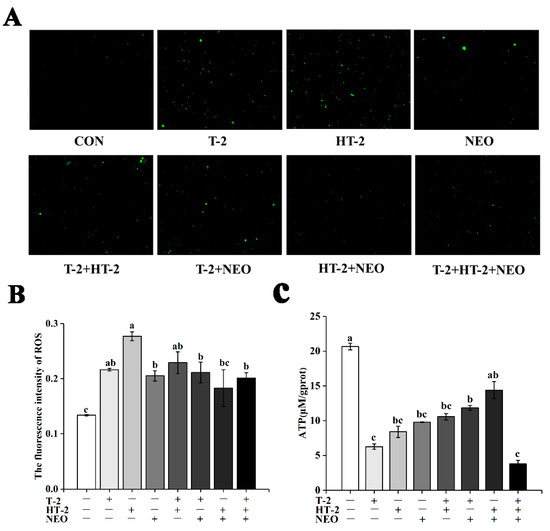 Intracellular ATP levels were determined using ATP assay kits obtained from Beyotime Biological Technology Co., Ltd. (Beyotime, Shanghai, China) [43,44]. After treatment with different concentrations of T-2, HT-2, and NEO individually and in combination, cells were lysed and centrifuged to collect the supernatant. Each well of the blank 96-well plate was incubated with 100 µL ATP detection working solution for 5 min at room temperature. Then, 20 µL of cell lysate and the luminescence were added to each well for assaying immediately by a microplate reader (BioTek Instruments Inc., Winooski, VT, USA). The levels of ATP in each well were calculated according to the standard curve and normalized to the protein concentration of each sample.