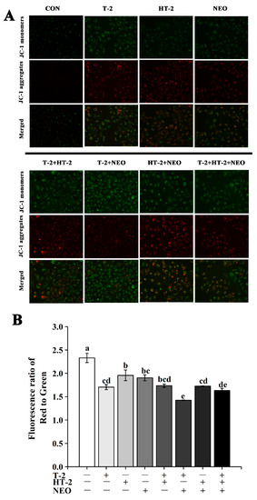 The mitochondrial membrane potential (MMP) was evaluated by the 5′,6,6′-tetrachloro-1,1′,3,3′-tetraethylbenzimidazolylcarbocyanineiodide (JC-1) dye. The JC-1 stain in viable cells showed the red fluorescence. Red fluorescence represents JC-1 aggregate and green fluorescence denotes JC-1 monomer, then the merged images showed the combination of green and red images (Figure 2A). The change of mitochondrial membrane potential was indicated by the ratio of red to green fluorescence. Compared with control, the mitochondrial membrane potential of all experimental groups was significantly decreased (p < 0.05, shown in Figure 2B). Under 50% cell activity, mitochondrial membrane potential of the T-2+NEO group was significantly lower than the other treatment groups (p < 0.05). Additionally, the mitochondrial membrane potential in T-2, HT-2+NEO, and T-2+HT-2+NEO groups was significantly lower than that in the HT-2 group (p < 0.05). These results exhibited significant mitochondrial fragmentation after exposure to single, binary, or ternary combinations of T-2 toxin, HT-2 toxin, and NEO.