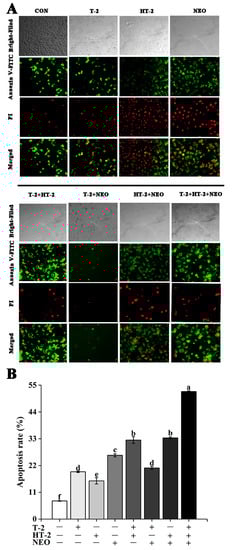 Cellular apoptosis was performed using an Annexin V-FITC/PI Cell apoptosis assay kit provided by Beyotime Biological Technology Co., Ltd. (Beyotime, China) [48]. In brief, cells were seeded into 6-well plates with a density of 2 × 105 cells/well and evaluated with different levels of T-2 toxin, HT-2 toxin, and NEO individually and in combination. After centrifugation and resuspension in staining buffer, the cells were incubated in Annexin V-FITC and PI solution for 20 min at room temperature. After being observed and photographed under visible light and fluorescence microscopy (40× objective lens), the apoptosis rate was calculated: