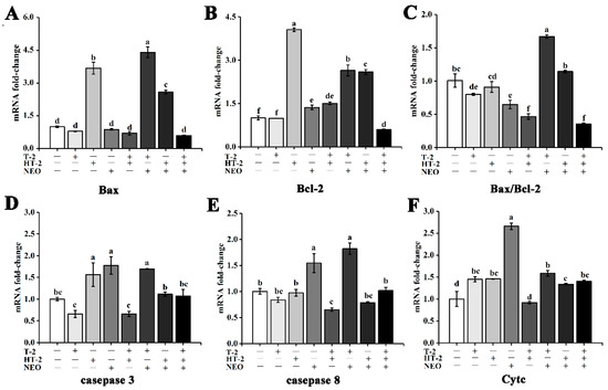 Under 50% cell activity, the expression level of the Bcl-2 gene was significantly upregulated (p < 0.05), except that in the T-2 group, and the expression level of the Bcl-2 gene was significantly downregulated in the T-2+HT-2+NEO group (p < 0.05). Additionally, the expression level of the Bcl-2 gene in the HT-2 group was significantly higher than other groups (p < 0.05, shown in Figure 4B).