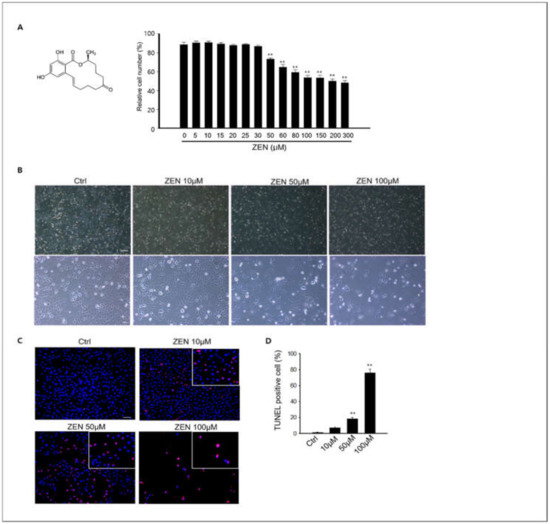 Specifically, the percentage of TUNEL-positive cells was significantly higher in the 50–100 nM ZEN treated groups than in the controls (Figure 1D).