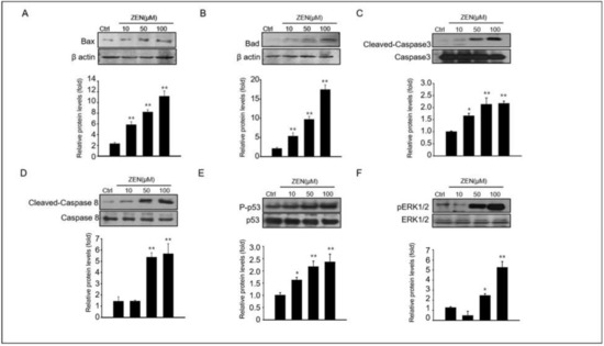 Next, we dissected the mechanism of ZEN-induced apoptosis in GC-1spg cells. The expression levels of key proteins involved in apoptosis such as cleaved caspase-3 and -8, BAD, BAX, phospho p53 and ERK1/2 were observed in GC-1 spg cells treated with ZEN at different doses (0–100 μM) (Figure 2). The levels of BAX and BAD proteins were increased, and activated caspase-3 and caspase-8 were dose-dependently enhanced in ZEN-exposed GC-1 spg (Figure 2A–D). MAPK proteins have been reported to be common apoptotic signaling molecules [30]. Our results also showed that treatment of GC-1 spg with ZEN resulted in increased p53 and ERK1/2 phosphorylation (Figure 2E,F). Specifically, the expression of all these proteins was significantly higher in 50–100 μM ZEN exposed GC-1 spg than in the control.