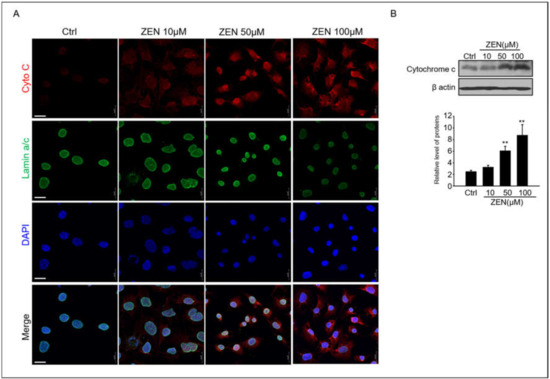 Cytochrome c is released from the mitochondria to the cytosol, where it participates in caspase activation [31]. Therefore, we investigated whether ZEN could induce the release of cytochrome c in GC-1 spg cells. The expression and localization of cytochrome c protein in GC-1 spg cells were observed using immunoblotting and confocal immunofluorescence microscopy, respectively. In Figure 3A, a strong expression of cytochrome c, which is red fluorescence in 50–10 μM ZEN-treated GC-1 spg cells, can be observed; this expression demonstrates a more diffuse localization pattern in ZEN-treated cells compared to the controls. Cytochrome c was redistributed in the region surrounding the lamin A/C+ nucleus envelope in ZEN-treated cells (Figure 3A). The protein levels of cytochrome c in ZEN-treated cells also consistently increased in a dose-dependent manner (Figure 3B).