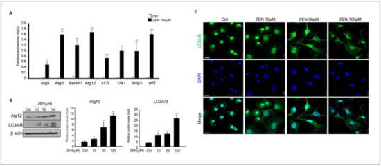 A recent study reported ZEN-induced autophagy in TM4 Sertoli testicular cells [32]. Based on these studies, we examined whether ZEN induced autophagy in GC-1 spg cells, even though ZEN induced apoptotic cell death. Our results showed that the expressions of autophagy-related genes such as Atg5, Atg3, Beclin1, LC3, Ulk1, Bnip3, and p62 significantly increased in 100 μM ZEN-treated GC-1spg cells compared to the control (Figure 4A). Additionally, we confirmed the expression levels of autophagy-related proteins. Immunostaining of LC3A/B revealed that ZEN-treated groups showed a remarkable increase in LC 3A/B positive puncta compared to the control in a dose-dependent manner by confocal microscopy analysis in GC-1spg cells (Figure 4B). The expression levels of both Atg12 and LC3A/B proteins were consistently higher in ZEN-treated groups than in the control in a dose-dependent manner, according to immunoblotting analysis (Figure 4C). These data suggest that ZEN can trigger autophagy in GC-1 spg cells as well as apoptotic cell death.