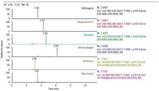 | Sample No. | Endophyte Species Taxonomy | Alternariol | Tentoxin | Meleagrin | Roquefortine C | Gliotoxin | Verruculogen |