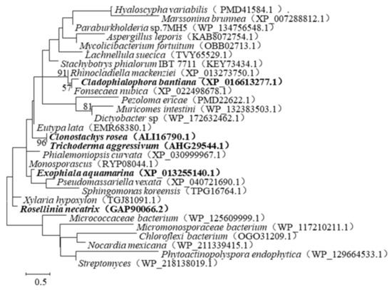 The sequences of the cla, exo, tri, and zhd101 gene from the Cladophialophora bantiana, Exophiala aquamarina, Trichoderma aggressivum, and C. rosea contained complete open reading frame (ORF). The length of sequences were 795 bp, 792 bp, 792 bp, and 792 bp, respectively. The overall G+C content of the genes were 41%, 42%, 42%, and 46%.