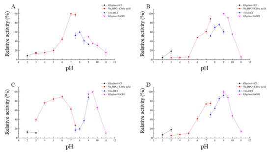 Effects of different pH on the enzyme activity of recombinant ZEN-degrading enzymes. (A) Effects of pH on CLA catalytic activity; (B) effects of pH on EXO catalytic activity; (C) effects of pH on TRI catalytic activity; (D) effects of pH on ZHD101 catalytic activity.