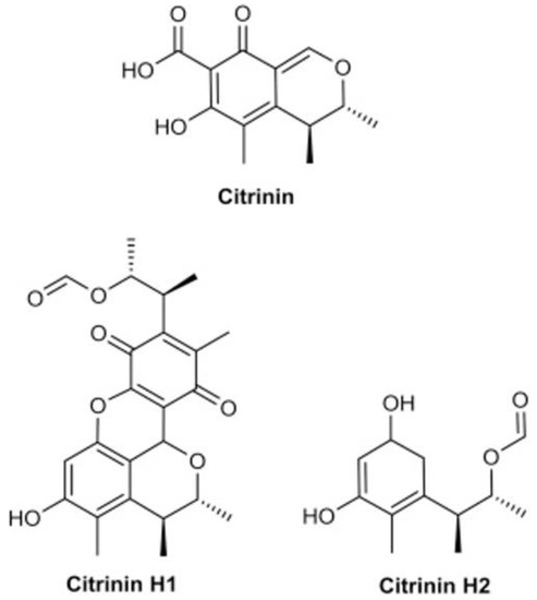 Mycotoxins are poisonous secondary metabolites produced by filamentous fungi infesting crops and grain before harvest in the field or after harvest during storage [1]. Improper storage conditions regarding moisture, temperature, and water activity play a significant role in the proliferation of storage fungi and the production of toxins. Citrinin (CIT) is a polyketide-derived mycotoxin most commonly occurring during storage [2,3,4]. Hetherington and Raistrick isolated CIT for the first time from a culture of Penicillium citrinum in 1930s [5]. Meanwhile, it was reported that the three fungal genera Penicillium (P. citrinum, P. verrucosum, and P. expansum), Aspergillus (A. carneus, A. niveus, and A. terreus), and Monascus (M. ruber) could produce CIT [4,5,6,7]. Recently, CIT has also been found in food colorings traditionally made in Asia from rice fermented with Monascus purpureus (“red mold rice”), conventionally used for meat preservation and food coloring [4,8].