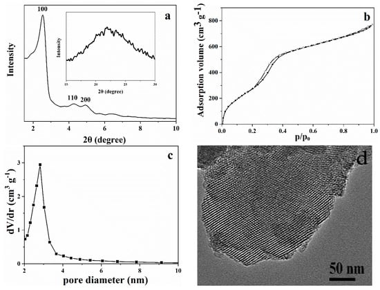 Characterization of MCM-41. (a) XRD patterns, (b) nitrogen adsorption–desorption isotherms, (c) pore size distributions, and (d) TEM image of MCM-41.