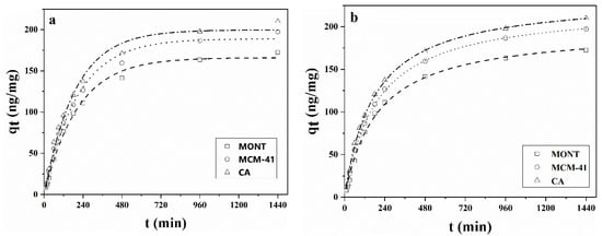 The efficiency of AFB1 adsorption by adsorbents evaluated in the present study was determined by adsorption kinetics in which the removal rate and adsorption time of AFB1 were measured. Adsorption kinetics of AFB1 by three adsorbents was performed at 25 °C with prolonged adsorption time. As shown in Figure 3a,b, rapid adsorption was observed in the initial 120 min, and no significant change in adsorption was verified after 960 min of treatment. This indicated that the removal rate reached an apparent equilibrium at this stage. The initial removal rate occurred relatively quickly since more adsorption sites located on the external surface of the adsorbent were available for reaction. However, as the external surface of the adsorbent was covered by AFB1 molecules, the adsorption rate was gradually reduced and then stabilized, suggesting that the adsorption of AFB1 on the inner surface of adsorbents occurred by interlayer diffusion []. Compared with previously published results [,], the slower adsorption kinetics of MONT, MCM-41, and CA in the oil phase compared to those in the aqueous solution could be due to the high viscosity of peanut oil (10.0 cP at 25 °C), which reduced the diffusion of the AFB1 molecules. In addition, oil micronutrients, such as vitamin E and sterols, might compete with the AFB1 for binding sites on the MCM-41 in the oil phase []. Therefore, the adsorption of AFB1 was more challenging in an oil-rich matrix such as peanut oil. Nonetheless, MCM-41 showed promising performance in the removal of AFB1 in peanut oil and thus had great potential for industrial application.