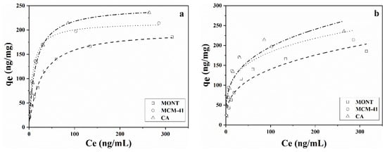 The adsorption isotherms of AFB1 on MONT, MCM-41, and CA were evaluated at 25 °C for 24 h with different initial concentrations of AFB1 (25–500 ng/mL). Langmuir and Freundlich adsorption isotherms were used to describe the adsorption process of AFB1 onto the three adsorbents. Langmuir adsorption isotherm was the most commonly used model describing the monolayer adsorption on a uniform surface and has been successfully applied to describe the adsorption process of many pollutants [,]. The Freundlich adsorption isotherm was widely used for empirical formulation to describe adsorption onto a non-uniform surface []. Figure 4 depicts the adsorption isotherms of AFB1 onto the three adsorbents. The three adsorption isotherms exhibited a quick initial increase and then stabilized, indicating that high-energy adsorption sites were first involved in the adsorption of AFB1 at low concentrations. The AFB1 adsorption isotherm parameters obtained from the Langmuir and Freundlich models are shown in Table 3. R2 values calculated with the Langmuir isotherms were higher than those calculated with the Freundlich isotherms, revealing a better fit of the Langmuir adsorption isotherm in describing the adsorption of AFB1. The results also indicated that AFB1 was adsorbed in a monomolecular layer onto the surface of the three adsorbents. Moreover, 1/n values from the Freundlich isotherms were below one, indicating a strong interaction between AFB1 and the three adsorbents []. The monolayer capacities (qmax) of the three adsorbents calculated based on the Langmuir isotherm were 199.41, 215.93, and 248.93 ng/mg.