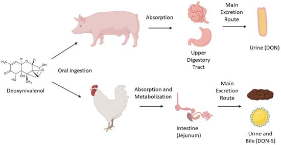 - Riahi, I.; Ramos, A.J.; Pérez-Vendrell, A.M.; Marquis, V. A toxicokinetic study reflecting the absorption, distribution, metabolism and excretion of deoxynivalenol in broiler chickens. J. Appl. Anim. Res. 2021, 49, 284–288. [Google Scholar] [CrossRef]