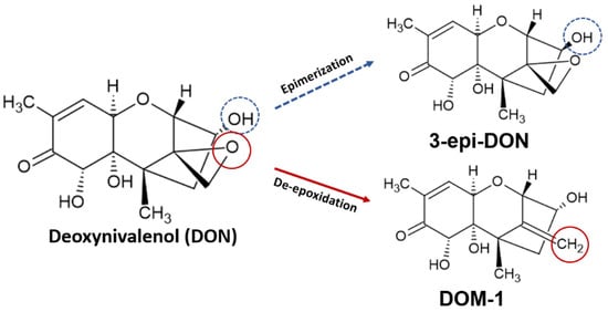 - Hassan, Y.I.; He, J.W.; Perilla, N.; Tang, K.; Karlovsky, P.; Zhou, T. The enzymatic epimerization of deoxynivalenol by Devosia mutans proceeds through the formation of 3-keto-DON intermediate. Sci. Rep. 2017, 7, 6929. [Google Scholar] [CrossRef] [PubMed] [Green Version]