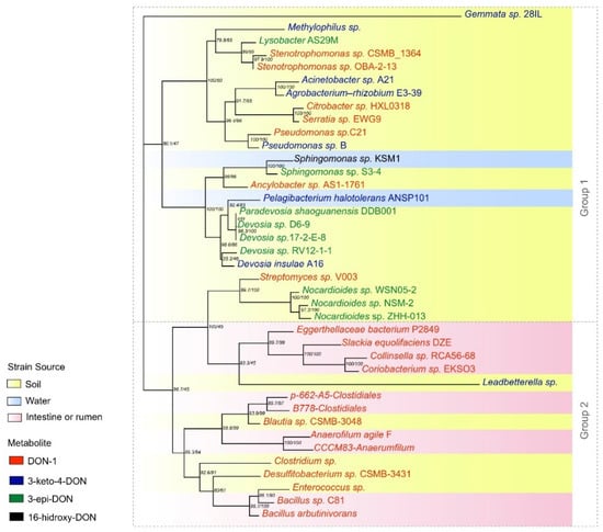 - Wang, G.; Wang, Y.; Ji, F.; Xu, L.; Yu, M.; Shi, J.; Xu, J. Biodegradation of deoxynivalenol and its derivatives by Devosia insulae A16. Food Chem. 2019, 276, 436–442. [Google Scholar] [CrossRef]