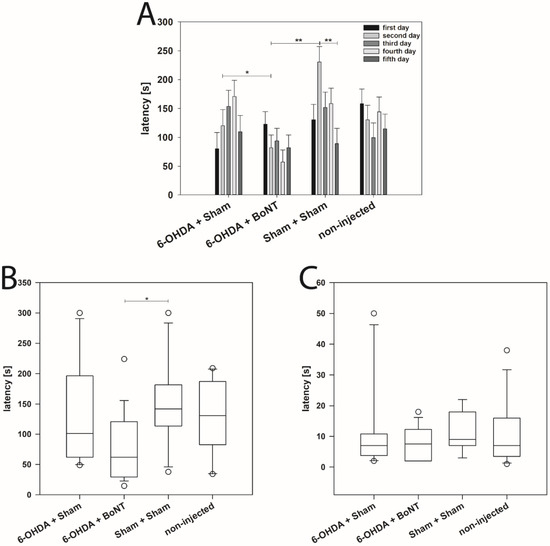 Rats were tested daily on 5 consecutive days. As seen in Figure 1A, rats of neither group showed a learning effect throughout the experiments; the time (latencies) to find and start eating the pellet varied considerably between the days and the rats of the various groups. Means of latencies were calculated for each group (Figure 1B). The latencies of non-injected (129.55 ± 17.56 s) and Sham + Sham (152.13 ± 20.95 s) rats did not differ significantly (p = 0.658). The respective values of 6-OHDA + Sham rats (127.02 ± 25.61 s) correspond roughly to those of the non-injected group. Thus, hemi-PD rats did not show significant olfactory deficits. Compared with Sham-treated hemi-PD rats (127.02 ± 25.61 s), 6-OHDA + BoNT rats (78.97 ± 13.47 s) tended to find the buried pellet faster (p = 0.253). However, the difference in latency between the 6-OHDA + BoNT rats and the Sham + Sham group was significant (p = 0.033) (Figure 1B).