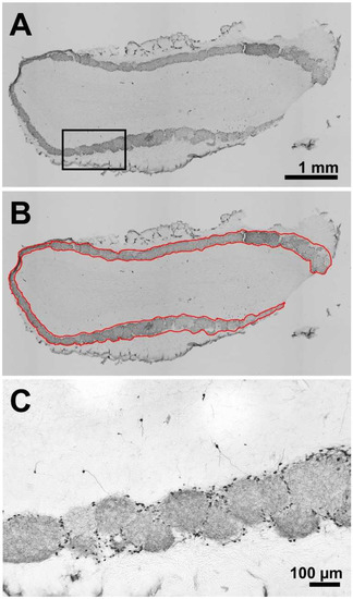 Frontal section of an OB used for densitometry (A–C). The section shows a left OB of a hemi-PD rat unilaterally lesioned into the right MFB, immunohistochemically reactive to TH (A,C). In (B), the glomerular layer is outlined (red) to define the region of interest for the evaluation algorithm. (C) Higher magnification marked by a rectangle in (A).