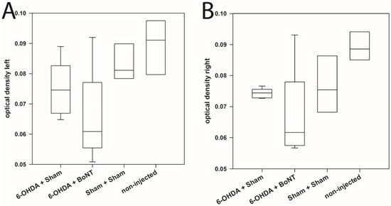 Densitometric analysis of the glomerular layer immunohistochemically reactive to TH of OB in both hemispheres revealed no significant interhemispheric differences in any of the 4 animal groups (Figure 3A,B): The median optical densities of the glomerular layer of the left and right OB of the non-injected rats were 0.091 and 0.089, of the Sham + Sham rats were 0.081 and 0.075, of the 6-OHDA + Sham rats were 0.075 and 0.074, and of the 6-OHDA + BoNT rats were 0.061 and 0.062. In addition, no significant differences between the optical densities of the glomerular layers were found between the respective values of the different experimental groups (p > 0.05) (Figure 3A,B).