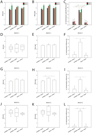 Calculation of relative interhemispheric differences of BPnd values revealed more differentiated results. In controls (Sham + Sham), no significant relative interhemispheric right/left differences were found: In PET/CT 1, mean BPnd values of the left OB (2.93 ± 0.26) and the right OB (2.96 ± 0.29) showed a small, non-significant relative interhemispheric difference of 1.32 ± 1.66% (Table 1, Figure 4C,F). Respectively, relative interhemispheric difference in the same range were found in PET/CT 2 and PET/CT 3 (Table 1, Figure 4C,I,L).