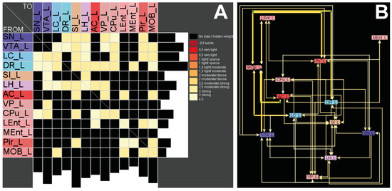 Based on the neuroanatomical components of the basal ganglia complex, as well as the main olfactory bulb (MOB), we first tested whether a direct neuronal connection exists between the MOB and CPu. This was found neither ipsilaterally nor contralaterally. Using the pathway analysis function of neuroVIISAS, all shortest pathways across intermediate regions between the CPu and the MOB were determined, and then filtered with respect to their geometric distance, as well as connection weights: The regions involved in Figure 5A,B represent the strongest connectivity between the MOB and CPu. The results were represented first as an adjacency matrix (Figure 5A). The tenses of the adjacency matrix contain the same regions and the same region sequences as the columns, so it is a square matrix. The rows indicate the source regions of the neural connections, and the columns indicate the regions that receive the connections (target regions) (Figure 5A). The connection weights represent semi-quantitative values in analogy to the data in the original research literature. Second, data are represented as a planar weighted and rectified orthogonal graph (Figure 5B). There is no direct connection from the CPu to the MOB. All connections from CPu to MOB have at least one intermittent region. With regard to the frequency of observations in tract-tracing publications, there are three possibly modified pathways: CPu→dorsal raphe nucleus→MOB, CPu→ventral tegmental area→MOB, CPu →amygdala complex→MOB are the most promising candidates for the BoNT-A-induced D2/D3R increase in hemi-PD rats (Figure 5B).