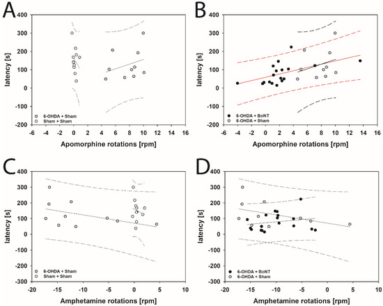 The latencies to find the pellet in the buried pellet test correlate with the apomorphine-induced rotations of rats of the 6-OHDA + Sham and Sham + Sham groups (A), and the 6-OHDA + BoNT and 6-OHDA + Sham groups (B). (C) The latency data correlate with the respective amphetamine-induced rotations of rats in the 6-OHDA + Sham and Sham + Sham groups and (D) of the 6-OHDA + BoNT and 6-OHDA + Sham groups. Only in rats of the 6-OHDA + BoNT group did (B) the latency to find the pellet significantly correlate with decreasing clockwise apomorphine-induced rotations. Regression lines are displayed as solid lines and prediction intervals as dashed lines. Red-colored regression line (B) and prediction interval lines indicate significant regression (p < 0.05).