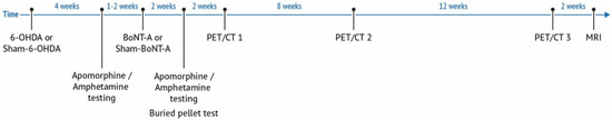 Timeline of the study design. Hemi-PD was induced by 6-OHDA injection into the right MFB. Controls received a Sham-6-OHDA injection. The degree of dopaminergic cell loss was verified with apomorphine- and amphetamine-induced behavioral testing. Six weeks after the 6-OHDA or Sham-6-OHDA injection, rats obtained BoNT-A or Sham-BoNT-A injection into the ipsilateral CPu. The positive effect on the motor behavior of BoNT-A was then controlled in rotation tests. To verify alterations of the olfactory ability, as well as the effect of the intrastriatal BoNT-A injections on the olfactory function in hemi-PD rats, the buried pellet test was conducted. Subsequently, each rat was scanned by [18F]fallypride-PET/CT analysis one, three, and six months post-BoNT-A or post-Sham-BoNT-A injection. A final MRI scan was performed as an anatomical reference for PET/CT imaging.