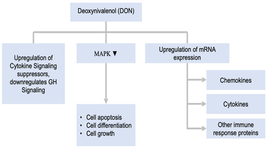Figure 2. The mechanism of deoxynivalenol (DON) metabolism. MAPKs = mitogen-activated protein kinases. The downward-facing triangle beside MAPK indicates its alteration/decline retards the processes controlling cell apoptosis, cell differentiation, and cell growth.