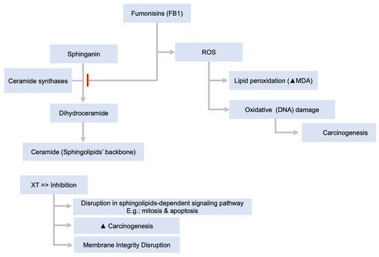Figure 3 shows the action mechanisms involving the breakdown of fumonisins. In particular, fumonisins exhibit their actions via various mechanisms, most of which are fully established, whereas others are either still under establishment or yet to be explored. The genotoxicity of FB1 is not fully understood, although in vitro studies showed that fumonisin B1 induced chromosomal aberrations and micronuclei [71,122,123]. The damage to the DNA may be due to the stimulation of lipid peroxidation and oxidative damage, which is consistent with the increase in malondialdehyde adducts and DNA oxidative damage of kidney and liver in rats and with lipid peroxidation in vivo after treatment of FB1 [124,125]. Liver carcinogenesis induced by fumonisin proceeds via the stages of initiation and promotion similarly to genotoxins, and it is time- and dose-dependent [126]. Fumonisin B1 disrupts the de novo synthesis of sphingolipids by inhibiting ceramide synthase, leading to several effects on cell functions and signaling pathways which depend on ceramide, complex sphingolipids, sphingoid base 1-phosphates, and sphingoid bases [127], including effects on mitosis and apoptosis, thereby possibly aiding carcinogenesis via altering the balance of cell replication and death [123]. The disruption of sphingolipid metabolism results in changes in the ratio of sphinganine to sphingosine, with an increase in the concentration of sphinganine in tissue, closely correlating with the in vivo carcinogenicity and toxicity of fumonisins [128]. Disrupted synthesis of fatty acids, phospholipids, and cholesterols, and their interaction with ceramide are thought to play an important role in the altered differential growth patterns of hepatocytes during the promotion of liver cancer [129]. In experimental animals, the role of hepatocytes in immunomodulation was thought to be via changes in the levels of cytokine, in vivo and in vitro, as well as via effects on responses to antibody vaccines in pigs infected with fumonisin B1 [123,125,128,130].
