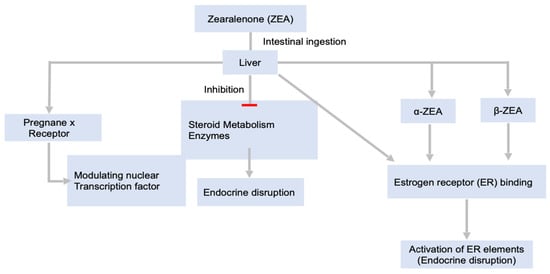 Figure 4. The action mechanisms involving zearalenone (ZEA). α-ZEA = α-zearalenol; β-ZEA = β-zearalenol. The red line signals liver functions to inhibit ZEA in competing with the steroid metabolism enzymes.
