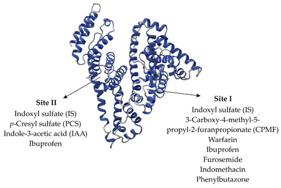 One of the main roles of HSA in the context of CKD is its capacity to bind with uremic toxins, especially PCS and IS. Recent studies report that IS is present in both I and II binding sites, with a preference for site II [43]. In contrast, PCS is present within site II [59,60] and possibly an unknown binding site, according to results achieved by Li et al. (2022) [43]. Figure 1 shows PBUTs and drugs that bind to sites I and II of albumin. Once in the bloodstream, about 85–95% of both IS and PCS bind to HSA. Albumin-toxin binding can be altered by the concentration of available albumin in plasma or by albumin updating due to factors such as heat [61].