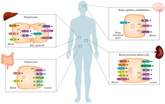 Multidrug and toxin extrusion (MATEs) are membrane proteins which are part of the SLC47 family, which is included in the SLC superfamily. The main representatives are MATE1 and MATE2-K, encoded by the SLC47A1 and SLC47A2 genes, respectively. Both mediate the cellular efflux of various compounds, particularly organic cations, presenting a large overlap with OCT substrates [158,159]. Basically, the transport mechanism of MATEs is antiport with the exchange of protons and organic cations [159]. MATE1 and MATE2-K are mainly expressed in the kidneys, but MATE1 can also be found in the liver, adrenal gland, heart, and others [82,160]. MATE1 and MATE2-K are found in the apical membrane of renal cells in the kidneys and are important for tubular secretion [82].