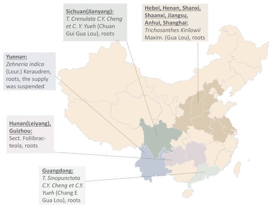 The sources of commercial Tian Hua Fen in China in the 1980s [3,7]. Researchers used the microscopic identification method to identify and authenticate commercial Tian Hua Fen in 21 provinces in China in the 1980s. The corresponding species names of their origins are shown on the map.