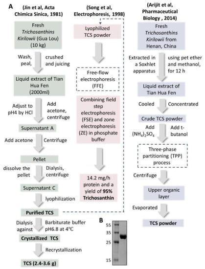 Tian Hua Fen itself was precipitated and made as injections, first used in 1972. The dosage was 5 mg per dose. It was then developed as more purified injections in 1975 with only 2 mg per dose. In 1982, the precipitated powder was further crystallized in barbitone buffer and came out as the single protein powder of trichosanthin (TCS) [10]. The dosage of these developed injections was further lower to 1.2 mg per dose [13], which won the second prize of the National Invention Award. The flowchart of three representative isolation and purification methods of TCS from Trichosanthes Kirilowii in different ways are shown in Figure 2, the SDS-PAGE gel photo of purified TCS is also demonstrated (Figure 2B).