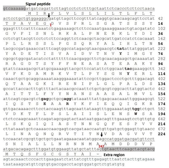 The DNA and protein sequences of TCS. The primary and nucleotide sequences of TCS (UniProt accession: Q6BBQ4; GenBank: M34858.1). The amino acids in the active centre are marked in bold. The signal peptide (−23–−1 aa) at N-termini and extra region (248–266 aa) at C-termini are underlined.