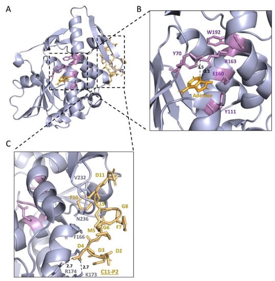 The structure of TCS (Figure 4a) consists of a large N-terminal domain with six alpha-helices, a six-stranded sheet, an antiparallel beta-sheet, and a small C-terminal domain with the largest distinct bent alpha-helix (Figure 4a) [51]. There is a cleft between which is also located the conserved domain of RIPs (Supplementary Figure S1). This cleft was conjectured as the active cleft, which was confirmed by mutagenesis studies in the 1990s [52,53,54]. In the active center, Tyr70, Tyr111, Glu160, Arg163, and Phe192 are important in their activity and interaction with adenine (Figure 4b) [50]. Ile71 and Gly109 form hydrogen bonds with N(1) and N(6) of the adenine molecule in the active site [54,55]. The structural comparison of TCS with other RIPs was conducted recently [56].