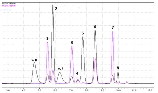 Chromatograms of a mix solution containing 11 CRMs, previously oxidized with periodate (black) or peroxide (pink). Identification of peaks with peroxide oxidation: 1—dcGTX2,3 (1st peak); 2—dcGTX2,3 (2nd peak); 3—C1,2; 4—dcSTX (1st peak); 5—dcSTX (2nd peak); 6—GTX2,3; 7—GTX5; 8—STX. Identification of peaks with periodate oxidation: 1—dcGTX2,3 (1st peak); 2—GTX1,4 + C3,4 + dcGTX2,3 (2nd peak); 3—C1,2; 4—dcNEO (1st peak); 5—NEO + GTX6 + dcSTX (2nd peak) + dcNEO (2nd peak); 6—GTX2,3 + products d and h (Figure S2) of GTX1,4 and C3,4, respectively; 7—GTX5; 8—STX + products f and j (Figure S2) of NEO and GTX6, respectively. (c, g, e and i correspond to the secondary products identified in Figures S1 and S2, in SI).